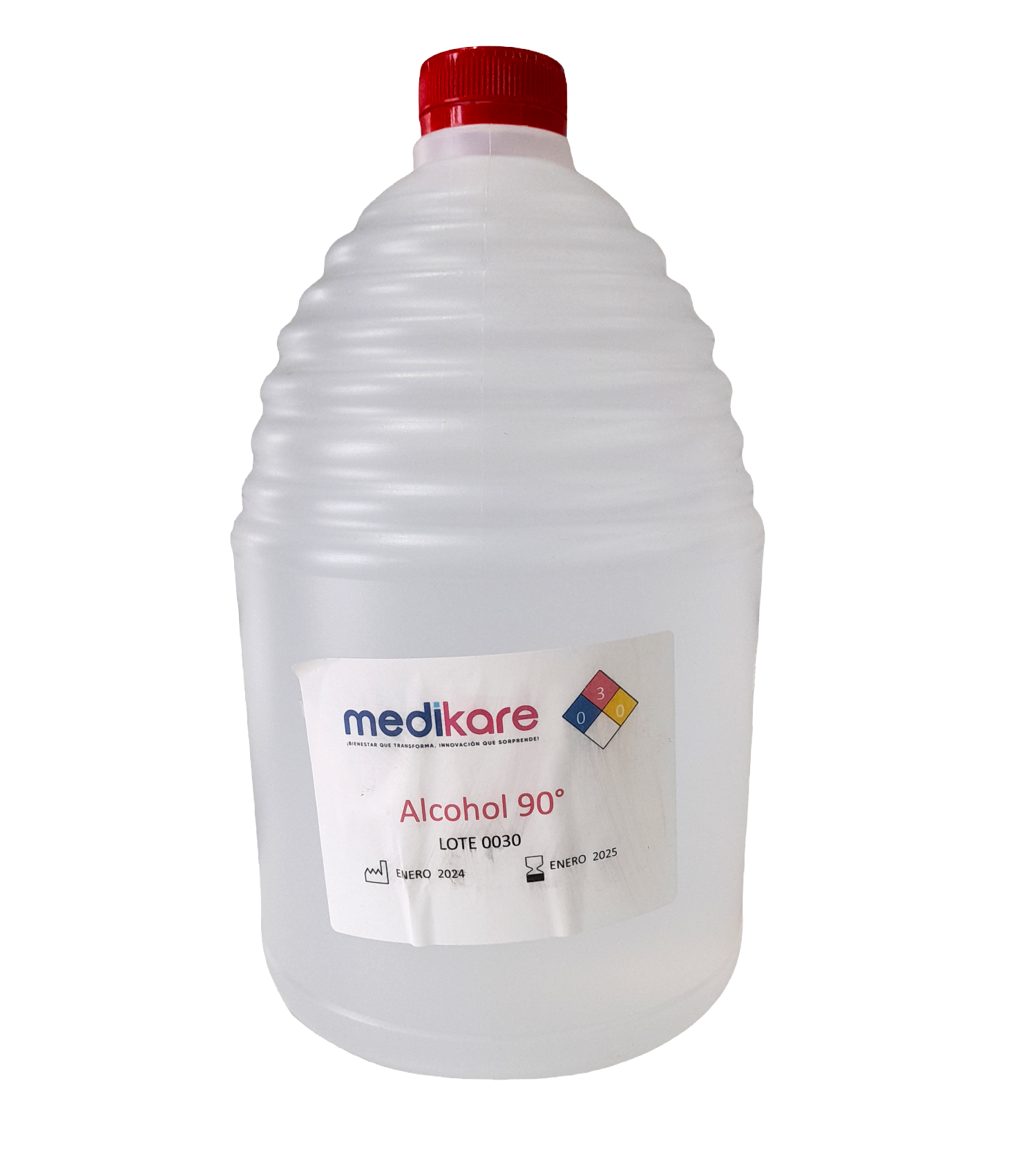 El alcohol etílico al 90% en presentación de galón (aproximadamente 3.78 litros) es una solución altamente concentrada con propiedades antisépticas y desinfectantes. Su composición lo hace eficaz para la eliminación de bacterias, virus y hongos. Viene en envase plástico resistente con tapa de seguridad, ideal para uso en clínicas, hospitales y laboratorios.