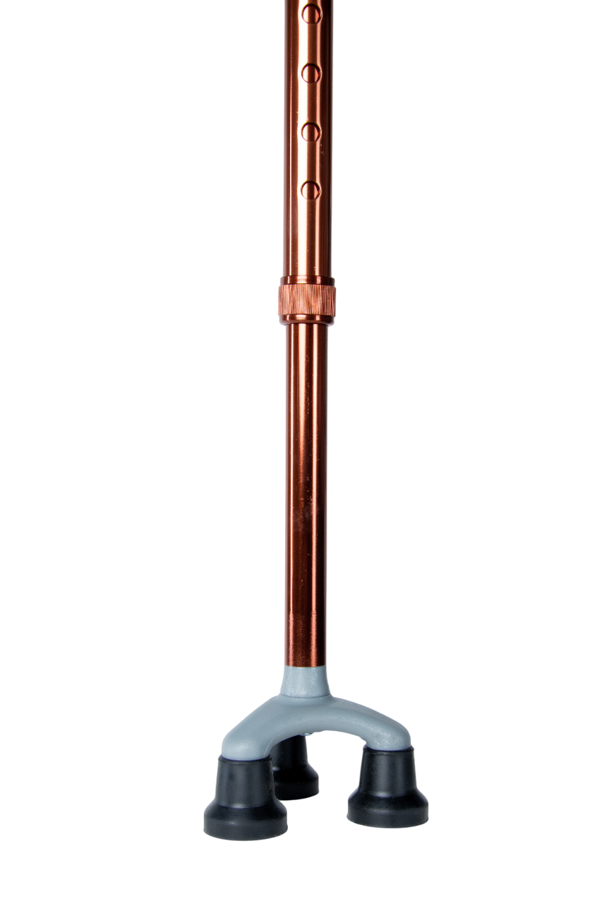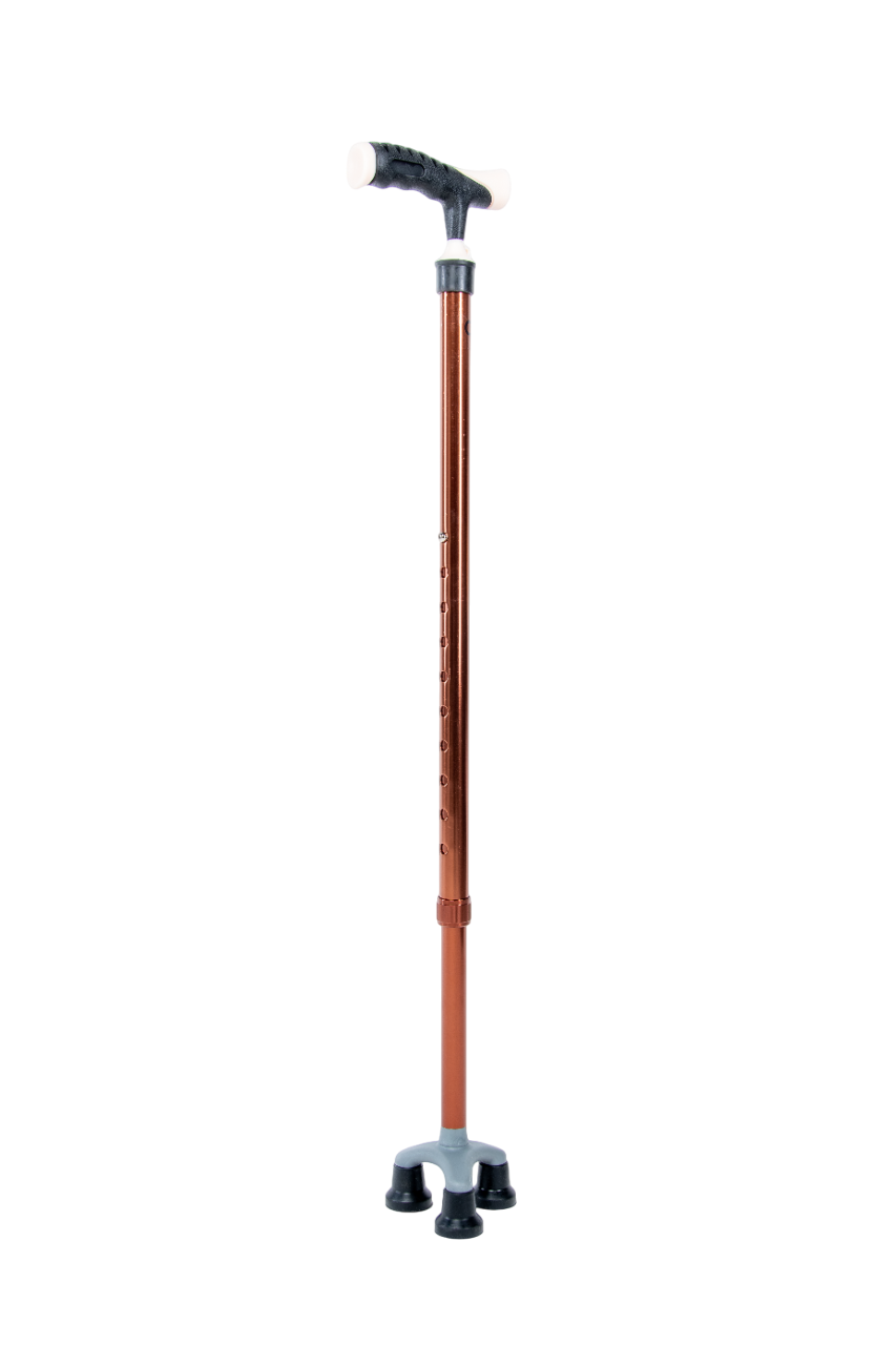 Este bastón cuenta con una base de tres puntos que proporciona mayor estabilidad que un bastón convencional. Está fabricado en aluminio anodizado de alta resistencia con acabado negro. Su mango tipo “T” está recubierto con goma antideslizante, ergonómicamente diseñado para mayor confort. Incluye un sistema de ajuste de altura por botón de presión y regatones de goma en cada uno de los tres puntos de apoyo para brindar mayor seguridad al caminar.