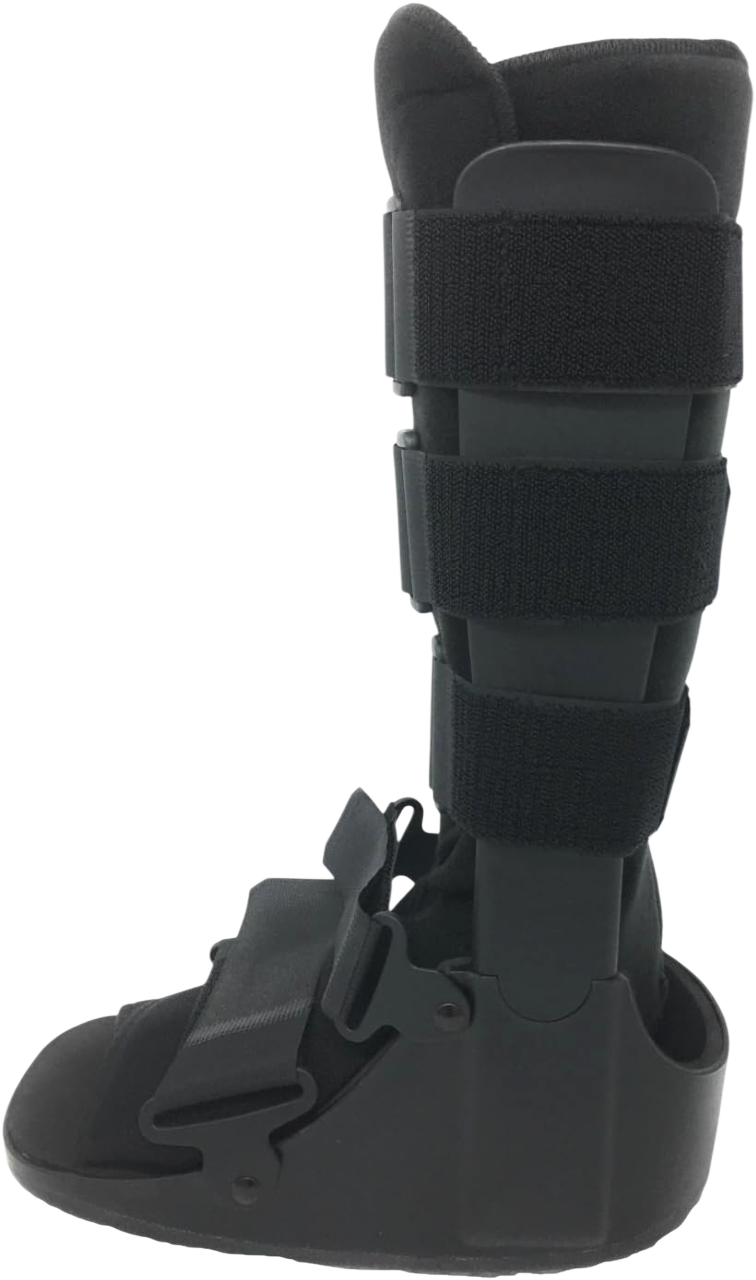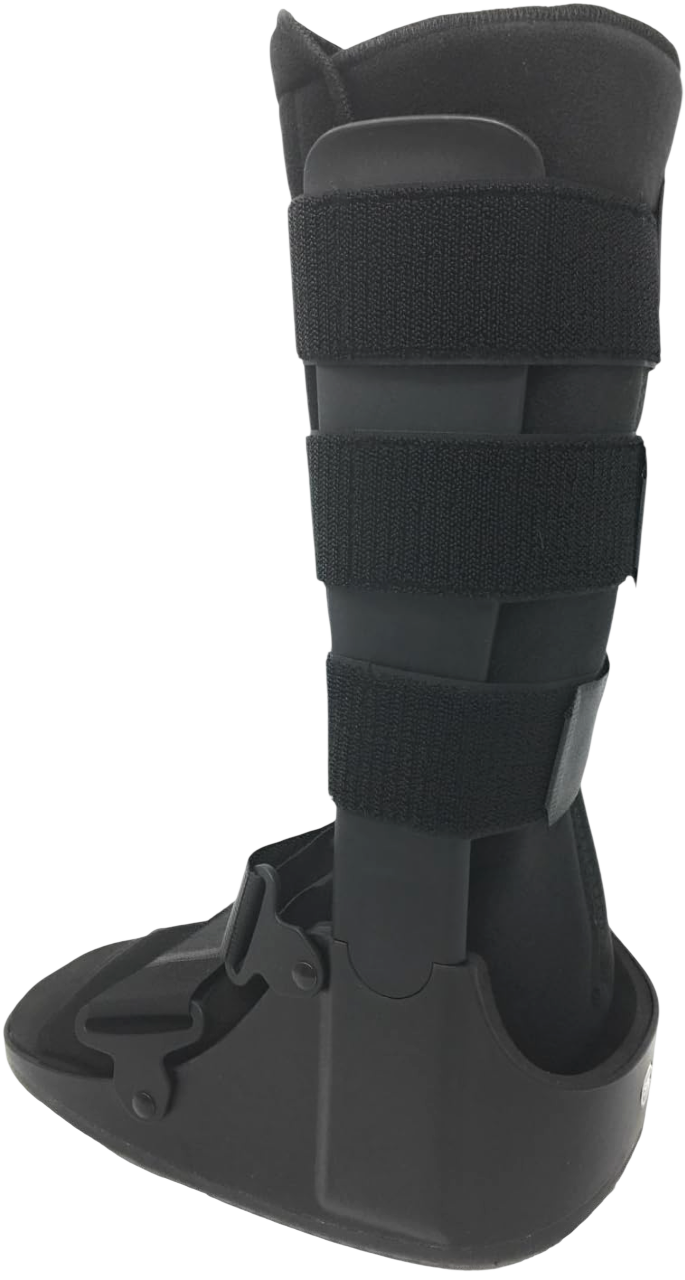 La bota ortopédica alta modelo 1791 está diseñada con una estructura rígida externa de plástico moldeado que proporciona inmovilización efectiva desde el pie hasta la parte inferior de la pierna. Incluye un sistema de cierres con correas de velcro ajustables que aseguran una sujeción firme y personalizada. La base tiene una suela antideslizante con diseño curvo tipo balancín que facilita el desplazamiento al caminar. El interior está acolchado para ofrecer confort y protección adicional durante su uso prolongado.