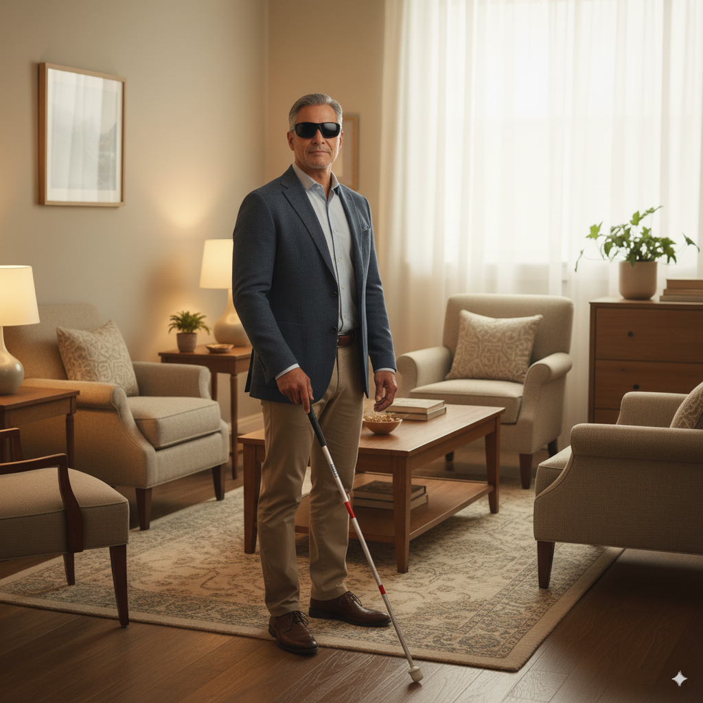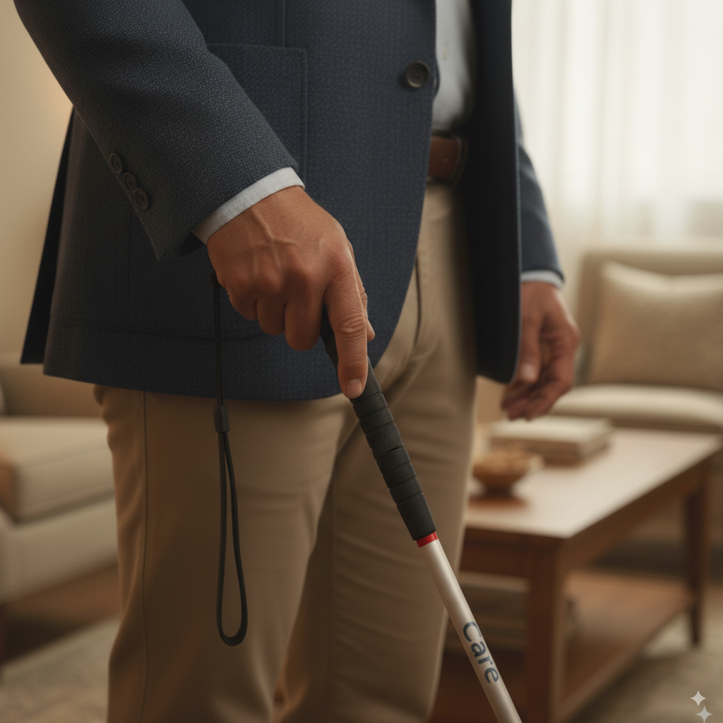 El diseño plegable permite transportarlo y guardarlo cómodamente, siendo una herramienta práctica y confiable para quienes requieren apoyo en su orientación y movilidad.