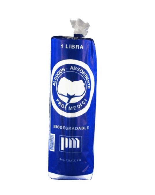 Rollo de algodón blanco 100% puro, procesado y blanqueado para uso médico. Presentación en paquete sellado biodegradable de 1 libra. Alta absorción, textura suave y libre de impurezas. No estéril.
